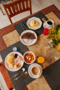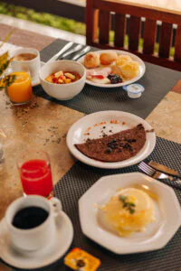 Tudo começa pelo café da manhã, servido com calma, como pede o ritmo da Bahia. Frutas tropicais frescas, bolos caseiros, pães, tapiocas feitas na hora e receitas regionais criam aquela mesa generosa que desperta o dia com sabor e energia.