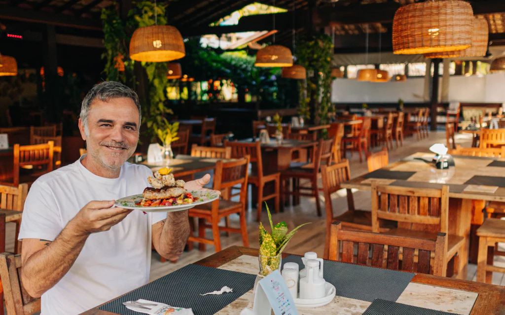 No almoço, a cozinha ganha ainda mais expressão. Pratos que valorizam ingredientes locais, frutos do mar frescos, temperos marcantes e preparações que equilibram tradição e criatividade. É uma gastronomia que respeita a cultura da região, mas também surpreende quem se senta à mesa.
